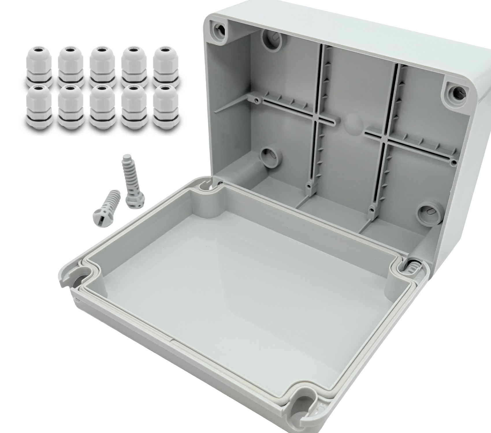 Das ARLI Set besteht aus einer Abzweigdose (250 x 200 x 90 mm) und 10 passenden Kabelverschraubungen (M12 x 1,5 mm) und ist ideal für vielfältige Elektroinstallationen sowohl im Innen- als auch im Außenbereich geeignet.