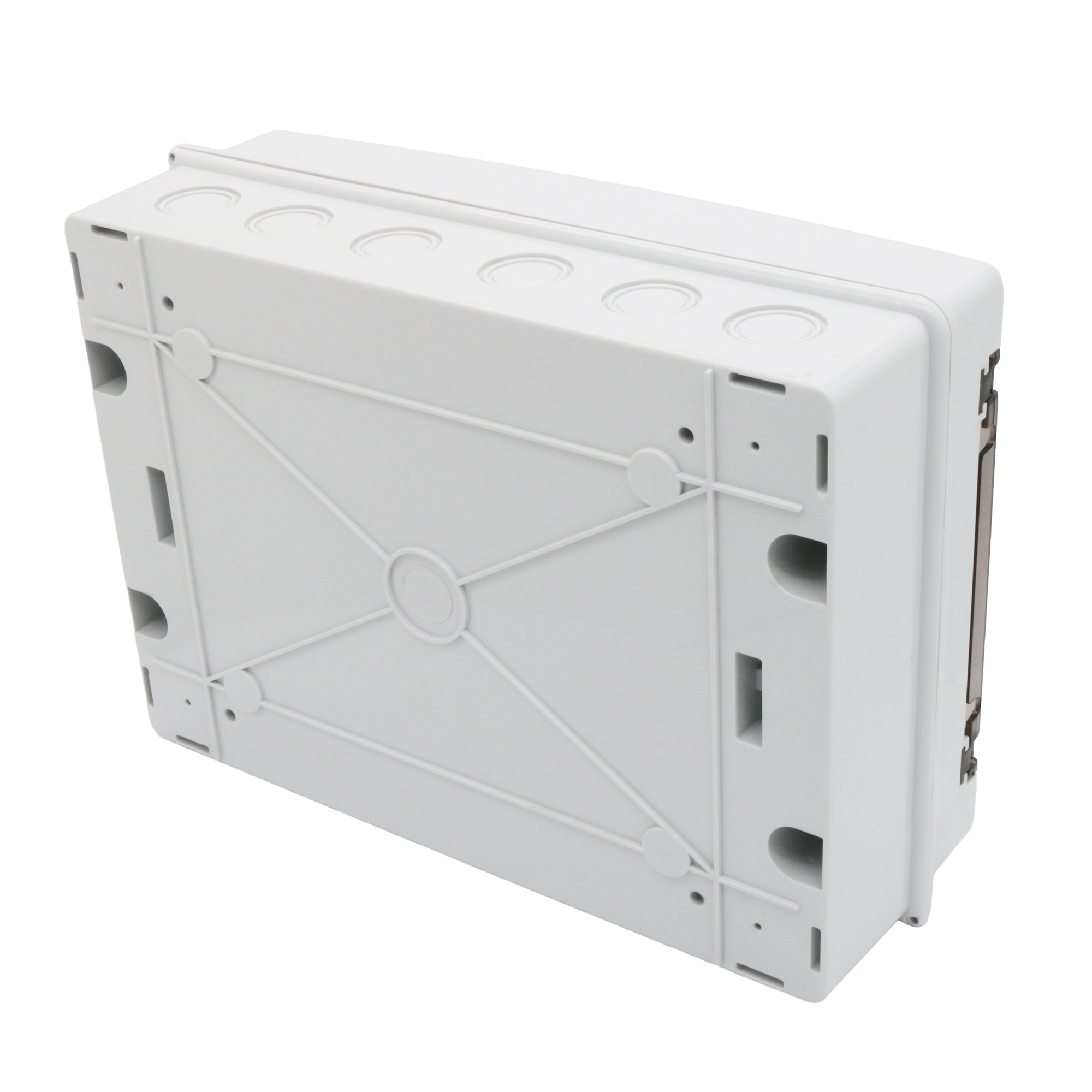 Die Gehäusewände sind mit Vorprägungen versehen, was das Einführen von Kabeln oder Installationsrohren erheblich erleichtert. Zusätzlich können bei Bedarf kleinere Öffnungen für Kabelverschraubungen oder dünnere Leitungen individuell mit handelsüblichem Werkzeug erstellt werden, perfekt für maßgeschneiderte Elektroinstallationen. Die Verwendung von Kabelverschraubungen wird empfohlen, um eine sichere und dichte Einführung zu gewährleisten.