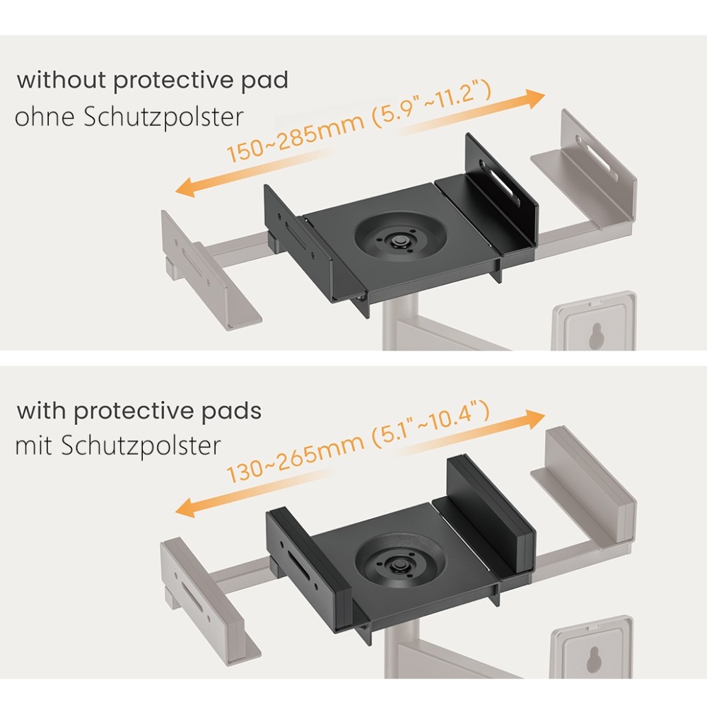 Dieses Lautsprecherhalterungs-Paar bietet eine flexible Anpassung und ist mit Lautsprechern verschiedener Marken kompatibel. Die ausziehbare Klemmstruktur der Trägerplattform mit rutschfesten Pads an den Seiten sorgt dafür, dass Lautsprecher in verschiedenen Größen sicher auf der Halterung sitzen. Die Plattform ist um 360° drehbar und kann horizontal sowie vertikal um 10° geneigt werden.