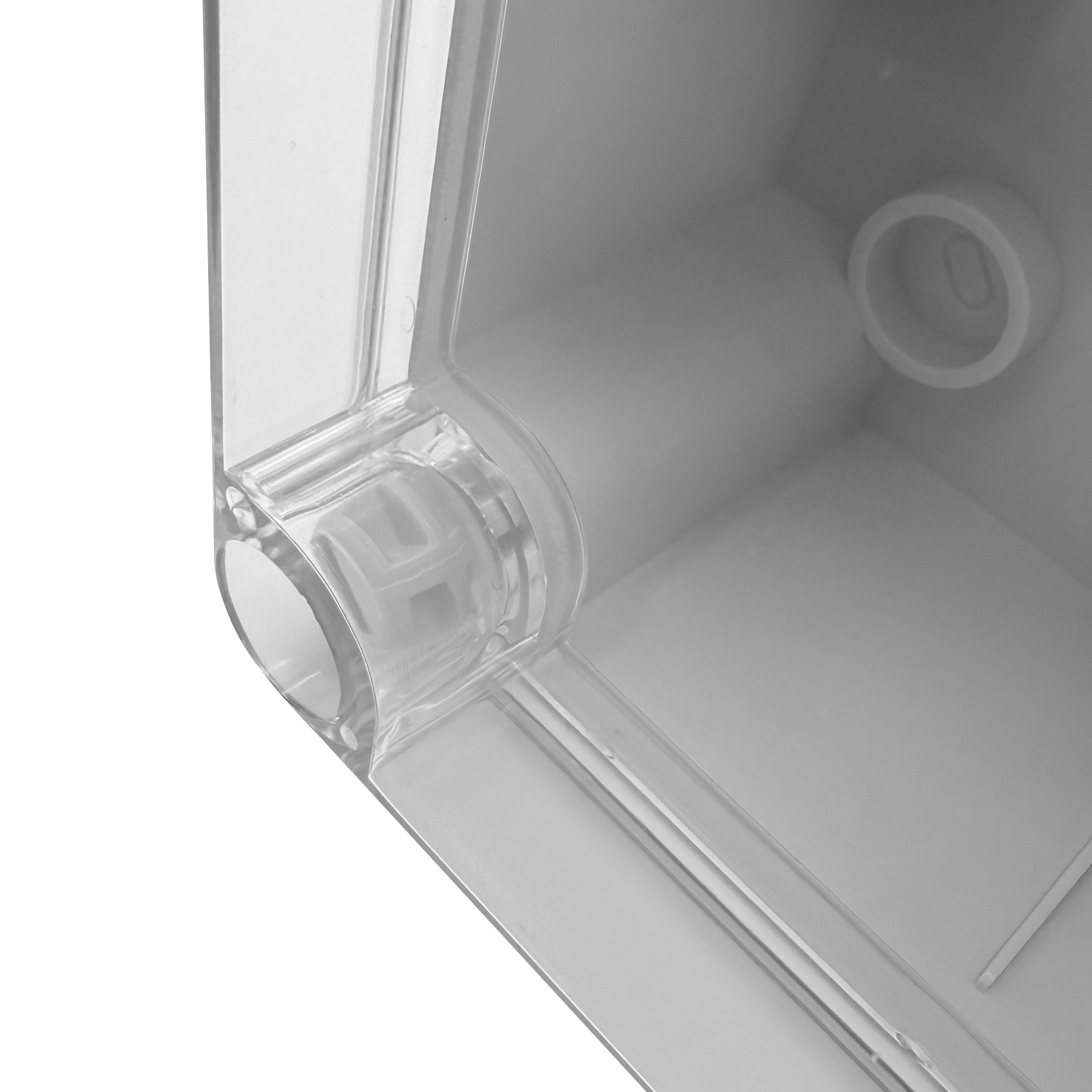 Für die Aufputzmontage konzipiert, ist das Gehäuse mit einer umlaufenden, integrierten Dichtung ausgestattet. Ein praktisches Detail: Der transparente Deckel kann während der Montage oder Wartung eingehängt werden, ohne vollständig entfernt werden zu müssen. Das erleichtert die Handhabung und spart Zeit – kein Ablegen des Deckels mehr notwendig.