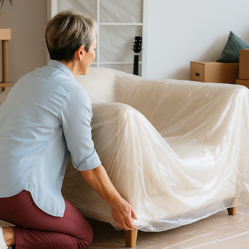 Transparente Abdeckfolie aus HDPE zum Schutz von Möbeln, Böden und Gegenständen während Renovierungs- oder Malerarbeiten. Die gefaltete Folie ist leicht zu handhaben und eignet sich ideal für den kurzzeitigen Einsatz im Innenbereich.