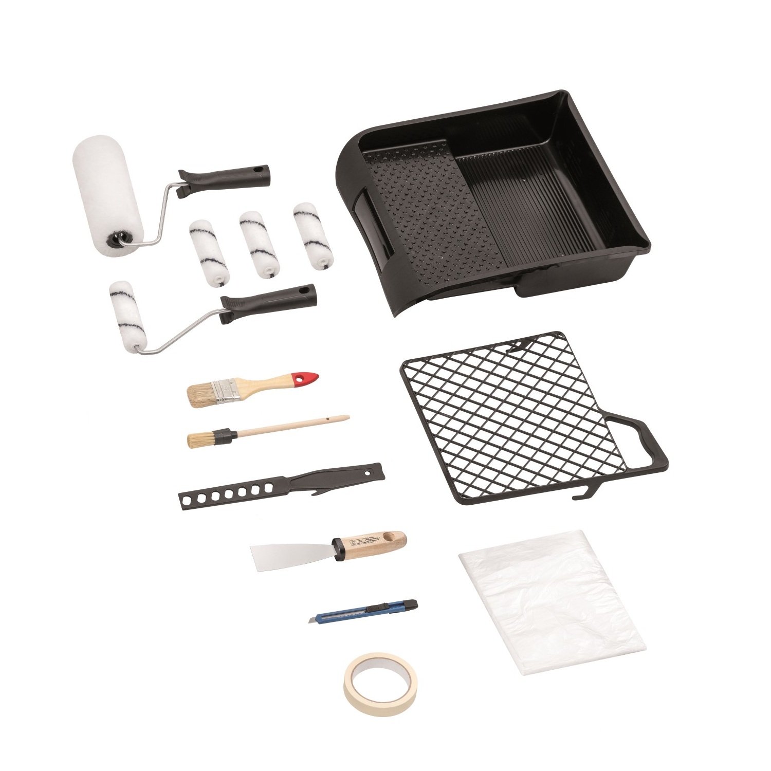 Ideal für Heimwerker und Renovierungsarbeiten im Haushalt. Das Set bietet eine solide Grundausstattung für Abdeck-, Streich- und Spachtelarbeiten und ermöglicht sauberes, effizientes Arbeiten.