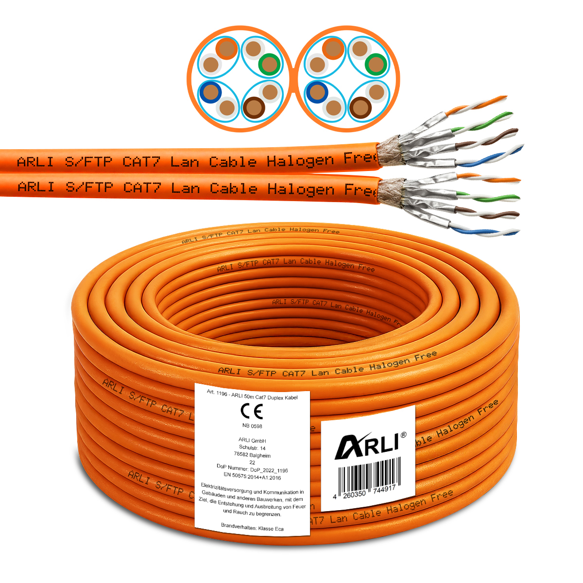 ARLI Duplex Cat7 Verlegekabel, 50 m, Netzwerkkabel, S/FTP, PIMF, halogenfrei, orange